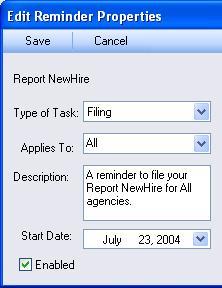 The left side of this screen contains all of the basic information about this reminder: its type, the filing or payment agency to which it applies, a description that you may edit, the date the reminder begins and whether or not it is currently enabled.