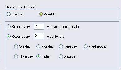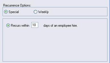 The top box shows a list of the different types of recurrence rules that may be used. In this case, New Hire may be set up on a 'Special' or a 'Weekly' schedule. There are two different weekly options. Different types of recurrence rules are available for different types of filings. An unemployment reminder, for instance, would have Quarterly recurrence options, a W2 would have Yearly options, and so forth. If you click on another type of filing, such as 'Special', the bottom box will update to display the new options. Below, there is only one option for the 'Special' recurrence type.