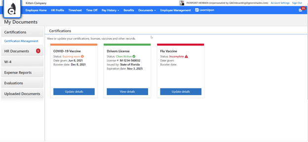 Employees will now see their certifications from their Green Employee account. Should employees be allowed to update a certification (based on the permissions added by the administrator), then they will be able to update any certification of any type in any of the following statuses—expired, expired/update now, incomplete, denied. Any certification of any other status will be view only for the employee.