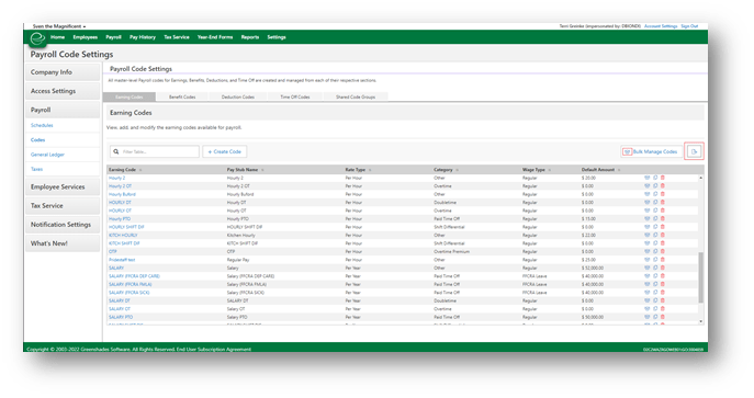 As of the first release in 2022, the Earnings code section received a new Bulk Manage Codes feature that allows users to make mass assignments of rates for employees. A new option to export the code information has been added alongside of the bulk assignment functionality. New Earnings Code Export option: