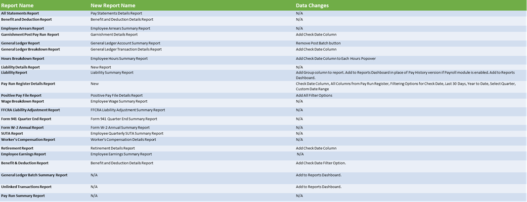 The full collection of Payroll reports has been reviewed and refined via the following list of changes:
