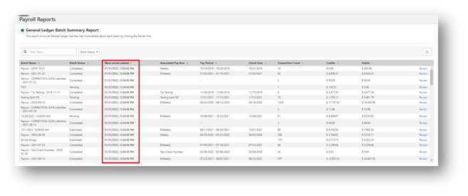 Multiple General Ledger screens have been updated to provide sync submission status information. See the below examples of the new “Current Status” field. Post Pay Run Review Screen:
