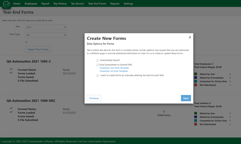 You will notice a new button label the next time you are ready to generate annual forms in Greenshades. To help clients navigate to the first steps in the process, a label change was made from “Create new formset” to Import Your Forms.